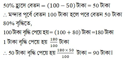 মন্দার কারণে শ্রমিকদের দৈনিক বেতন 50% হ্রাস করা হলো। 1 বছর পর দৈনিক বেতন 80% বৃদ্ধি করা হয়। মন্দার পূর্বে দৈনিক বেতন 100 টাকা হলে বর্তমানে শ্রমিকের দৈনিক বেতন কত?