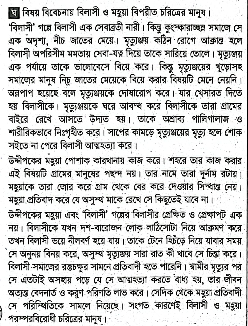 মহুয়া শহরে একটি পোশাক কারখানায় কাজ করে। তার শহরে কাজ করার বিষয়টি গ্রামের কিছু মানুষ পছন্দ করে না। উপরন্তু তার নামে দুর্নাম রটনা করে। ঈদের ছুটিতে বাড়ি এলে গ্রামের মানুষগুলো মহুয়ার নামে বিচার বসায়। তারা মহুয়াকে জোর করে গ্রাম থেকে বের করে দেওয়ার সিদ্ধান্ত নেয়। কিন্তু মহুয়া তাতে প্রতিবাদ করে। অসুস্থ মাকে রেখে সে কিছুতেই কোথাও যাবে না।`বিলাসী ও মহুয়া পরস্পর বিপরীত চরিত্রের মানুষ।`- মন্তব্যটি যাচাই করো।