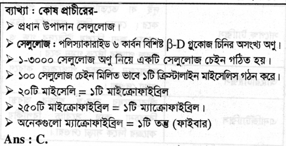 উদ্ভিদের কোষপ্রাচীর কোন উপাদান দিয়ে তৈরী? Option A: লিপিড , Option B: প্রোটিন , Option C: সেলুলোজ, Option D: কাইটিন, correct answer is: সেলুলোজ