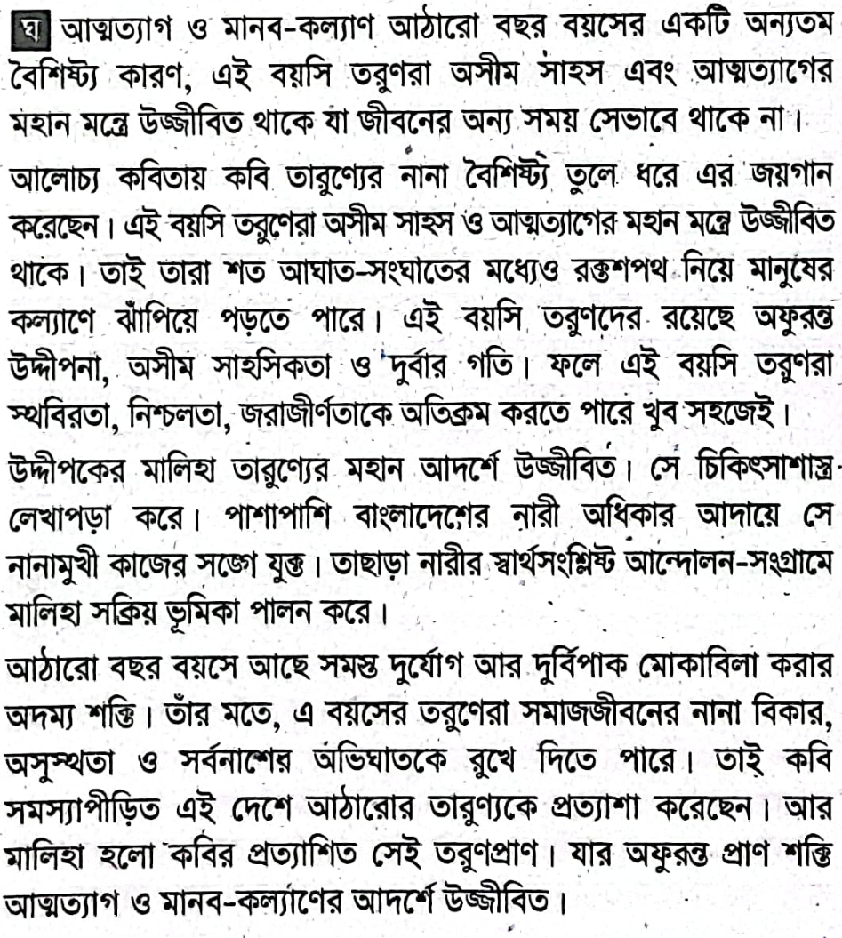 মালিহা আর নীলা সহপাঠী। দুজনই লেখাপাড়ায় বেশ ভালো। স্কুলজীবন পার হতে না হতেই নীলা মিশে যায় কিছু বখাটে বন্ধুর সাথে। এখানে তার শিক্ষাজীবনের পরিসমাপ্তি ঘটে। তার নাম শুনলে মেয়েরা আঁতকে ওঠে। অপরদিকে মালিহা কলেজ পেরিয়ে মেডিকেল কলেজে পড়ে। বাংলাদেশের অবহেলিত নারীদের অধিকার আদায়ে সে এখন কাজ করে। আন্দোলন-সংগ্রামে নেতৃত্ব দেয়। সংগঠিত করে সহপাঠী মেয়ে বন্ধুদের, আর প্রতিজ্ঞা করে জীবন দিয়ে হলেও নারীদের যথাযথ অধিকার প্রতিষ্ঠা করবেই।`আত্মত্যাগ ও মানব-কল্যাণ আঠারো বছর বয়সের একটি অন্যতম বৈশিষ্ট্য`- উদ্দীপক ও `আঠারো বছর বয়স` কবিতার আলোকে তাৎপর্য মূল্যায়ন করো।