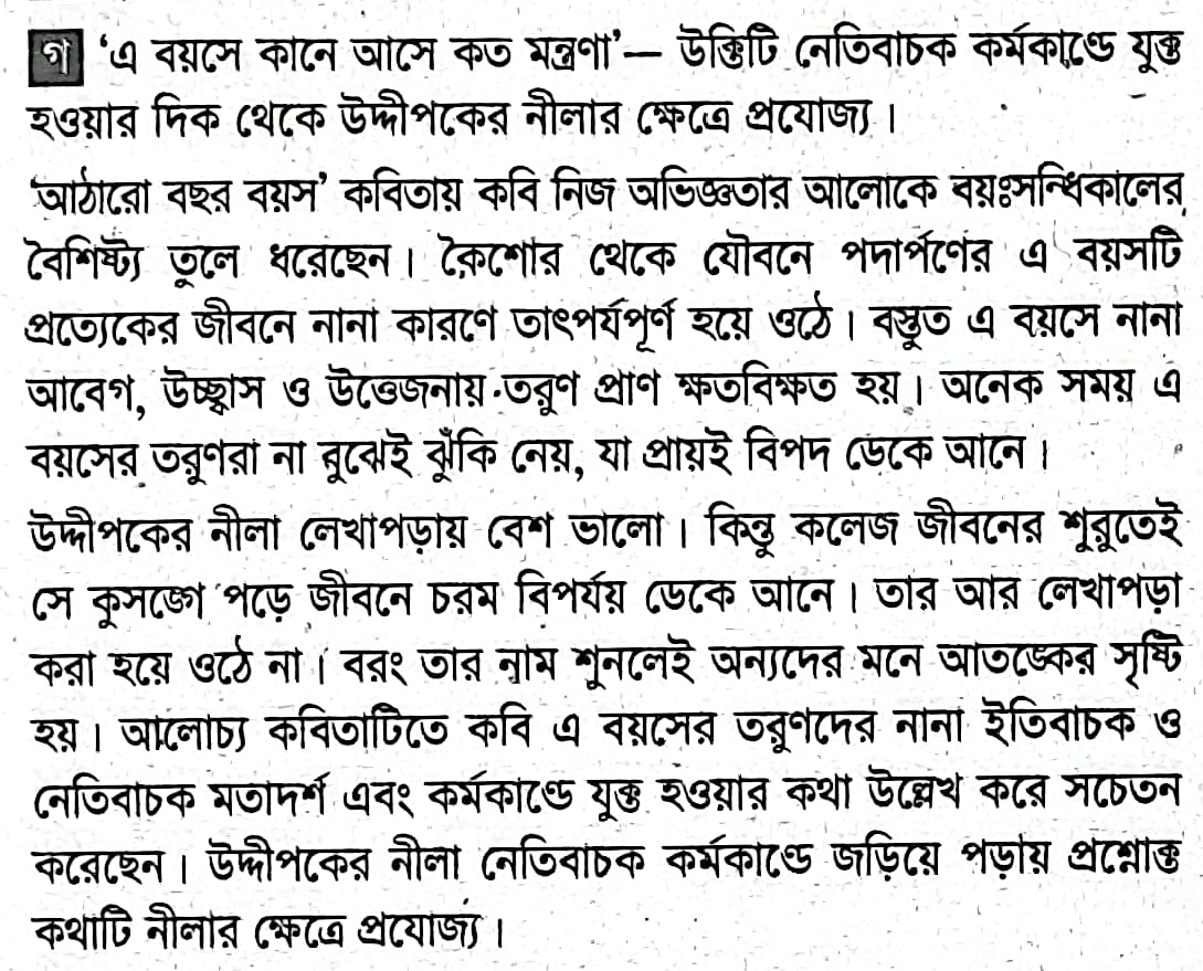 মালিহা আর নীলা সহপাঠী। দুজনই লেখাপাড়ায় বেশ ভালো। স্কুলজীবন পার হতে না হতেই নীলা মিশে যায় কিছু বখাটে বন্ধুর সাথে। এখানে তার শিক্ষাজীবনের পরিসমাপ্তি ঘটে। তার নাম শুনলে মেয়েরা আঁতকে ওঠে। অপরদিকে মালিহা কলেজ পেরিয়ে মেডিকেল কলেজে পড়ে। বাংলাদেশের অবহেলিত নারীদের অধিকার আদায়ে সে এখন কাজ করে। আন্দোলন-সংগ্রামে নেতৃত্ব দেয়। সংগঠিত করে সহপাঠী মেয়ে বন্ধুদের, আর প্রতিজ্ঞা করে জীবন দিয়ে হলেও নারীদের যথাযথ অধিকার প্রতিষ্ঠা করবেই।`এ বয়সে কানে আসে কত মন্ত্রণা`-উক্তিটি উদ্দীপকের নীলার ক্ষেত্রে কীভাবে প্রযোজ্য? বুঝিয়ে দাও।