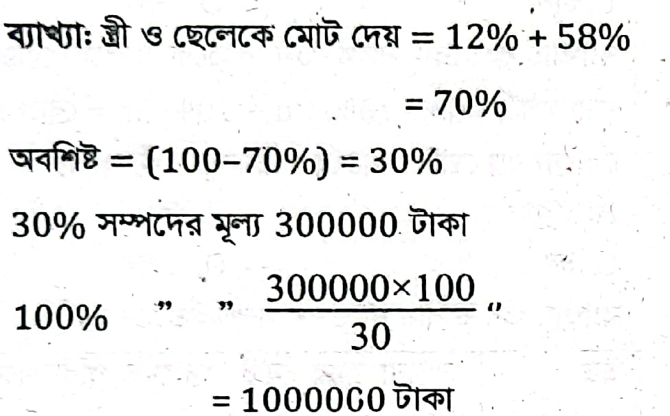 মি. রেজা তার সম্পদের 12% স্ত্রীকে, 58% ছেলেকে এবং অবশিষ্ট 3,00,000 টাকা মেয়েকে দিলেন। তার সম্পদের মোট মূল্য কত?