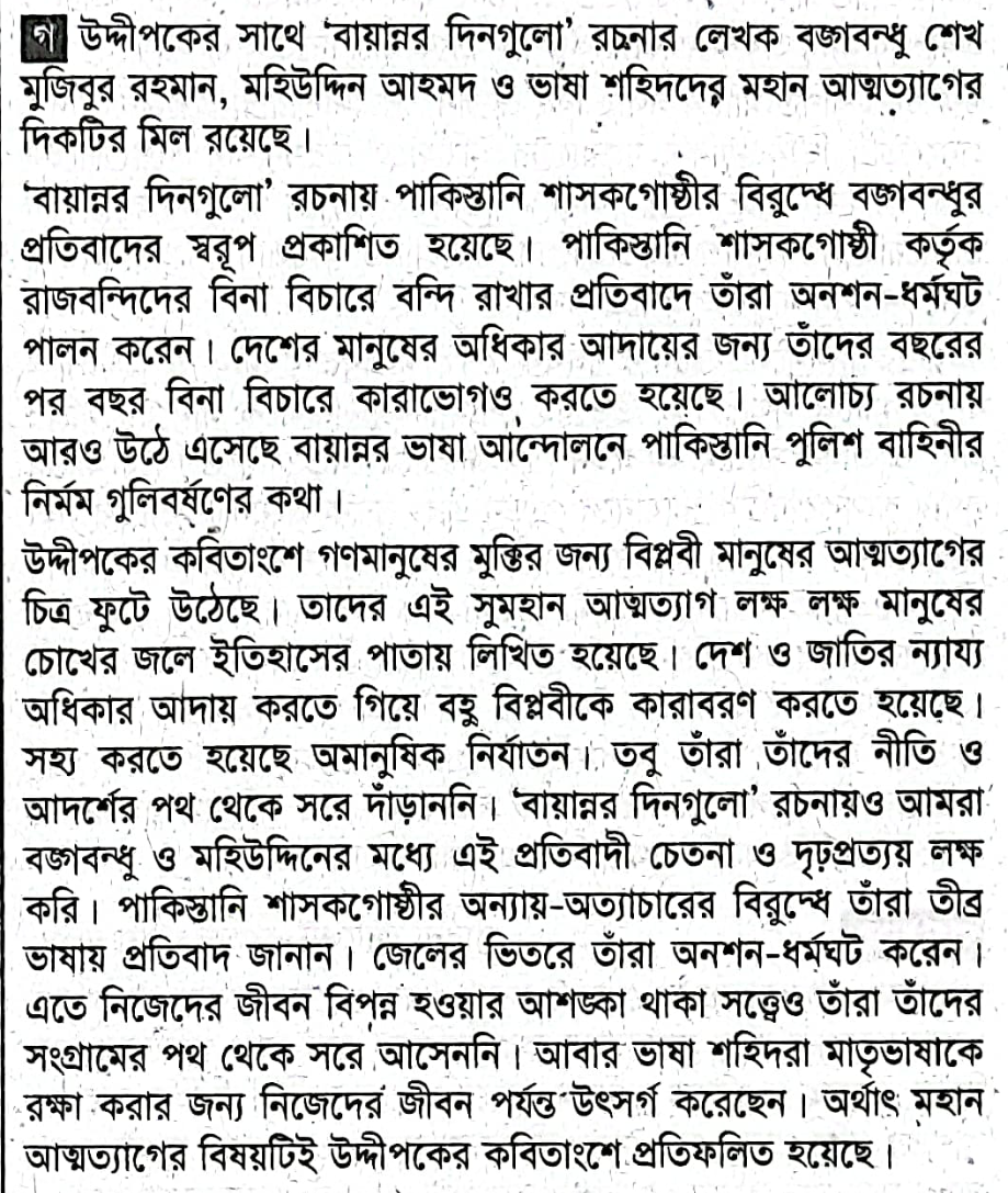 মুক্তির মন্দির সোপানতলেকত প্রাণ হলো বলিদান,লেখা আছে অশ্রুজলে।কত বিপ্লবী বন্ধুর রক্তে-রাঙাবন্দিশালার ওই শিকল ভাঙাতাঁরা কি ফিরিবে আজ সুপ্রভাতে,যত তরুণ অরুণ গেছে অস্তাচলে।উদ্দীপকের বিজয়ী বীরের স্বদেশ প্রত্যাবর্তনের সাথে বঙ্গবন্ধুর জেলমুক্তির সম্পর্ক আলোচনা করো।