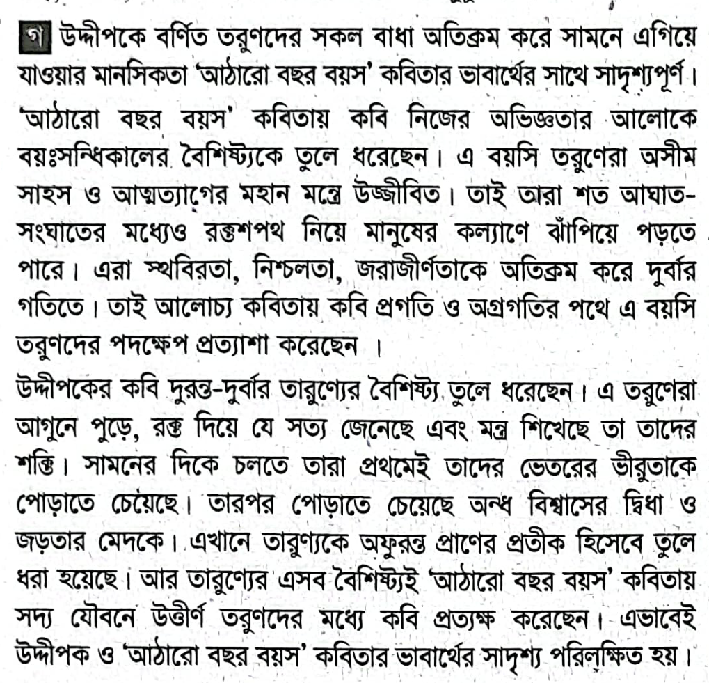 `যে যাবে না সে থাকুক, চলো আমরা এগিয়ে যাই,যে সত্য জেনেছি পুড়ে, রক্ত দিয়ে, যে মন্ত্র শিখেছি,আজ সেই মন্ত্রের সপক্ষে নেব দীপ্র হাতিয়ার।শ্লোগানে কাঁপুক বিশ্ব, চলো আমরা এগিয়ে যাই।প্রথমে পোড়াই চলো অন্তর্গত ভীরুতার পাপ,বাড়তি মেদের মতো বিশ্বাসের দ্বিধা ও জড়তা।`উদ্দীপকটির বক্তব্য `আঠারো বছর বয়স` কবিতার বক্তব্যের সাথে কি সাদৃশ্যপূর্ণ? আলোচনা করো।