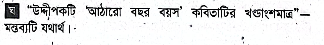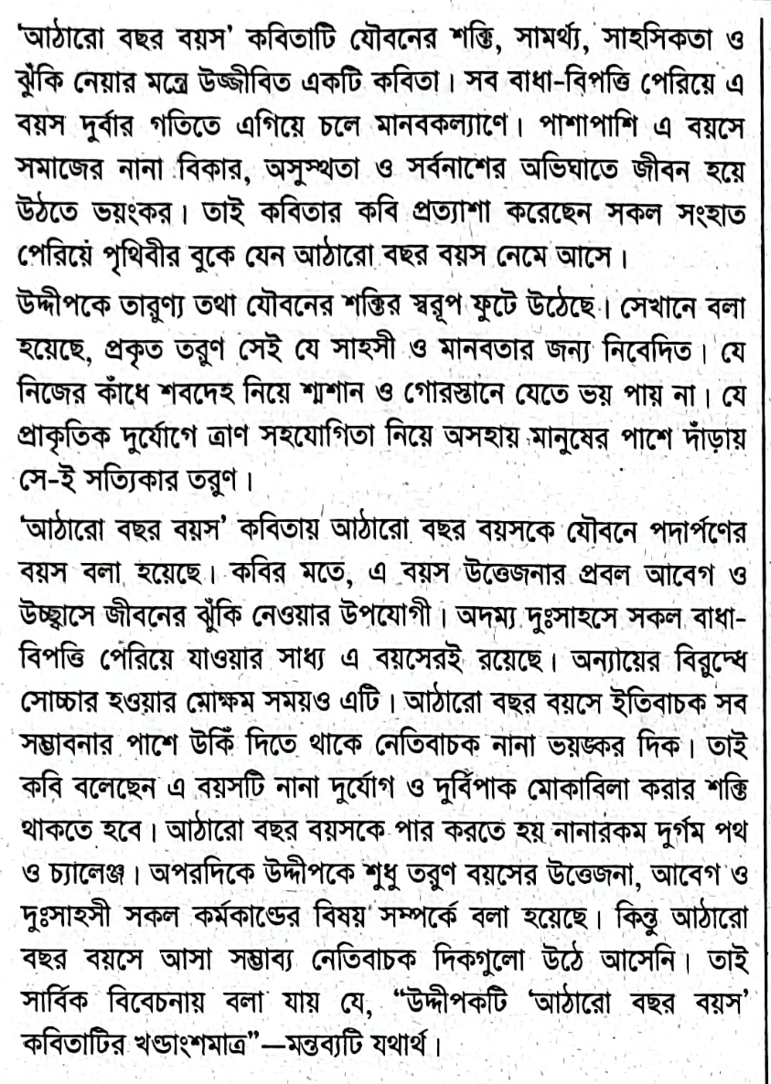 শব বহন করিয়া যখন সে যায় শ্মশানঘাটে, গোরস্তানে, অনাহারে থাকিয়া যখন সে অন্ন পরিবেশন করে দুর্ভিক্ষ বন্যাপীড়িতদের মুখে, বন্ধুহীন রোগীর শয্যা পাশে যখন সে রাত্রির পর রাত্রি জাগিয়া পরিচর্যা করে, যখন সে পথে পথে গান গাহিয়া ভিখারি সাজিয়া দুর্দশাগ্রস্তদের জন্য। ভিক্ষা করে, যখন দুর্বলের পাশে বল হইয়া, দাঁড়ায়, এই ধর্ম যাহাদের তাহারাই তরুণ।`উদ্দীপকটি `আঠারো বছর বয়স` কবিতাটির খন্ডাংশমাত্র।`- মন্তব্যটি যাচাই করো।