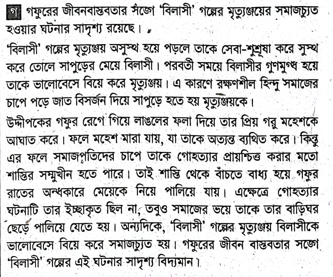 শরৎচন্দ্রের `মহেশ` গল্পে গফুরের প্রিয় গরুটির নাম মহেশ। দরিদ্র গফুর নিরীহ পশুটিকে ঠিকমতো খাবারের জোগান দিতে পারে না। ফসল নষ্ট করার জন্য তাকে জমিদারের শাস্তিও পেতে হয়েছে। একদিন তৃষ্ণার্ত মহেশ পানির জন্য গফুরের মেয়ে আমিনার মাটির পাত্র ভেঙে ফেলে। রাগান্বিত গফুর লাঙলের ফলা দিয়ে মাথায় আঘাত করলে মহেশ মারা যায়। গোহত্যার প্রায়শ্চিত্ত করতে গফুর রাতের আঁধারে মেয়েকে নিয়ে পালিয়ে যেতে বাধ্য হয়।গফুরের জীবনবাস্তবতার সাথে `বিলাসী` গল্পের কোন ঘটনার সাদৃশ্য বিদ্যমান?