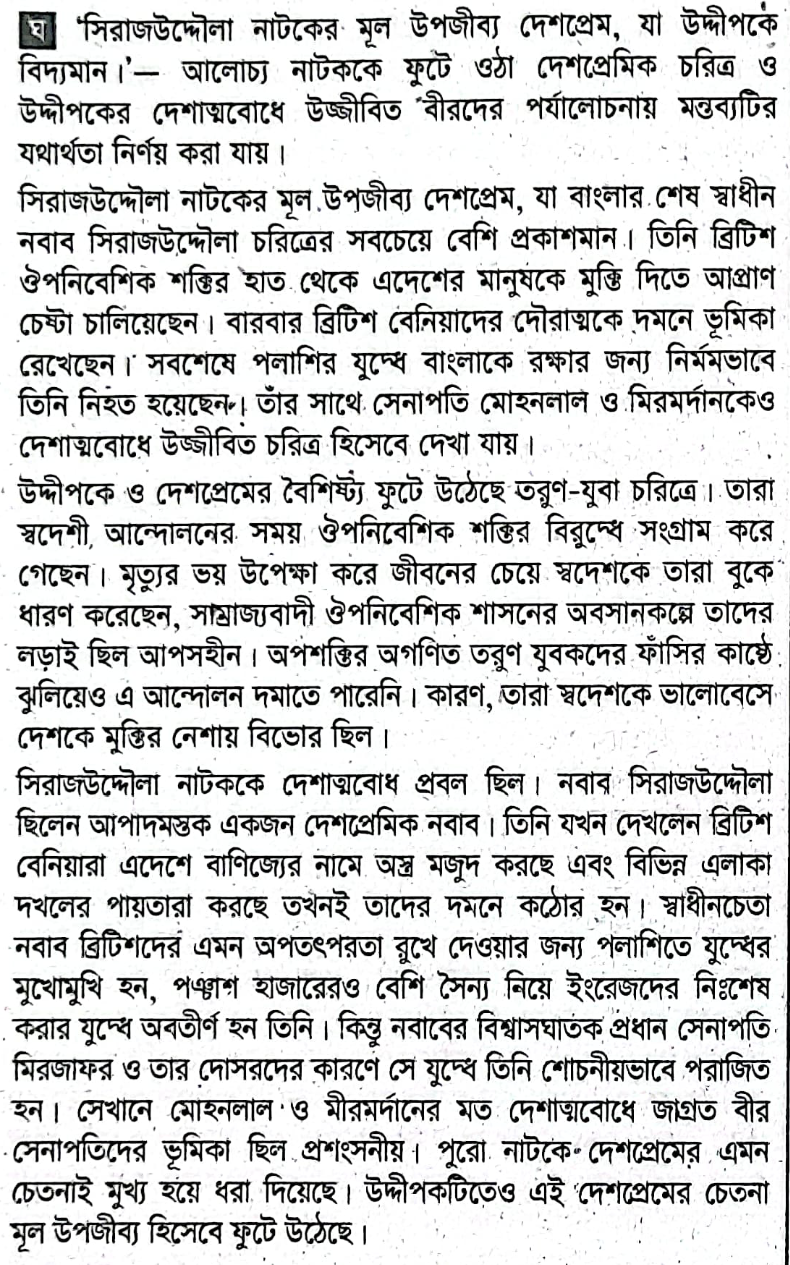 সাম্রাজ্যবাদী ব্রিটিশ সরকার দীর্ঘকাল ঔপনিবেশিক ভারতবর্ষে শাসনের নামে চালিয়েছে শোষণের স্টিমরোলার। এ সময় ভারতে স্বাধীনতার দাবিতে দানা বেঁধে ওঠে স্বদেশি আন্দোলন। ভারতবর্ষ জুড়ে তীব্র আন্দোলনে ব্রিটিশ সাম্রাজ্যের ভিত কেঁপে ওঠে। ফলে এ আন্দোলনকে চিরতরে স্তব্ধ করে দেওয়ার জন্য সাম্রাজ্যবাদী সরকার ভারতের অগণিত তরুণ-যুবাকে ফাঁসিকাষ্ঠে ঝোলায়। মৃত্যু অবধারিত জেনেও মুক্ত স্বদেশের স্বপ্নে বিভোর আন্দোলনকারীরা পিছপা হননি। স্বদেশিদের দুর্বার এ সংগ্রামে তেত্রিশ কোটি ভারতবাসীর ছিল অকুণ্ঠ সমর্থন।`সিরাজউদ্দৌলা` নাটকের মূল উপজীব্য দেশপ্রেম, যা উদ্দীপকে বিদ্যমান?”- তোমার উত্তরের পক্ষে যুক্তি দাও।