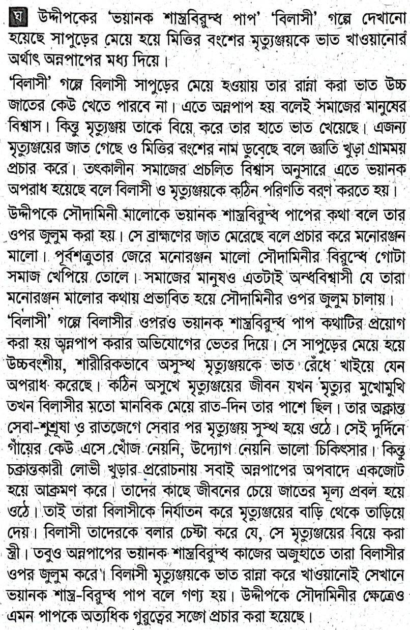সৌদামিনী মালোর পালিত পুত্র হরিদাসকে নিয়ে মনোরঞ্জন মালো গ্রামময় প্রচার করে দিলো। যে সৌদামিনী ভয়ানক শাস্ত্রবিরুদ্ধ পাপ কর্ম করেছে। ব্রাহ্মণের জাত মেরেছে সে। সৌদামিনী মালোর সাথে মনোরঞ্জন মালোর শত্রুতা আগে ছিল ব্যক্তিগত এখন তা সমাজগত ব্যাপার হয়ে দাঁড়িয়েছে। শুধু একা মনোরঞ্জন মালো নয় সমস্ত গ্রাম সৌদামিনী মালোর বিরুদ্ধে জুলুম শুরু করল।উদ্দীপকের `ভয়ানক শাস্ত্রবিরুদ্ধ পাপ` `বিলাসী` গল্পে কীভাবে দেখানো হয়েছে? বিশ্লেষণ করো।