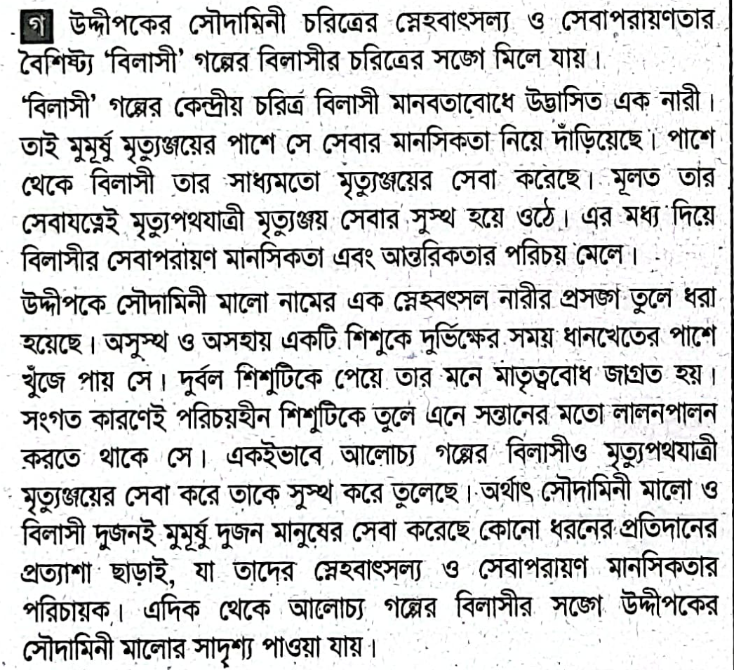 সৌদামিনী মালো স্বামীর মৃত্যুর পর উত্তরাধিকার সূত্রে ধানি জমি, বসত-বাড়ি, পুকুরসহ কয়েক একর সম্পত্তির মালিক হয়। এই সম্পত্তির ওপর নজর পড়ে সৌদামিনীর জ্ঞাতি দেওর মনোরঞ্জনের। সৌদামিনীর সম্পত্তি দখলের জন্য সে নানা কৌশল অবলম্বন করে। একবার সৌদামিনী দুর্ভিক্ষের সময় ধানখেতের পাশে একটি মানব শিশু খুঁজে পায়। অসহায় অসুস্থ শিশুটিকে সে তুলে এনে পরম যত্নে সন্তানের মতো লালন-পালন করে। মনোরঞ্জন সৌদামিনীকে সমাজচ্যুত করতে প্রচার করে যে নমঃশূদ্রের ঘরে ব্রাহ্মণ সন্তান পালিত হচ্ছে। এ যে মহাপাপ। সমাজের জাত-ধর্ম সব শেষ হয়ে গেল।সৌদামিনী চরিত্রের সঙ্গে `বিলাসী` গল্পে বিলাসীর সাদৃশ্য তুলে ধরো।