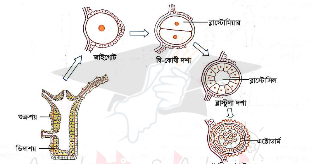 জাইগোট→ গ্যাস্ট্রুলা →মরুলা →হাইড্রুলা→ ব্লাস্টুলা→ পূর্ণাঙ্গ