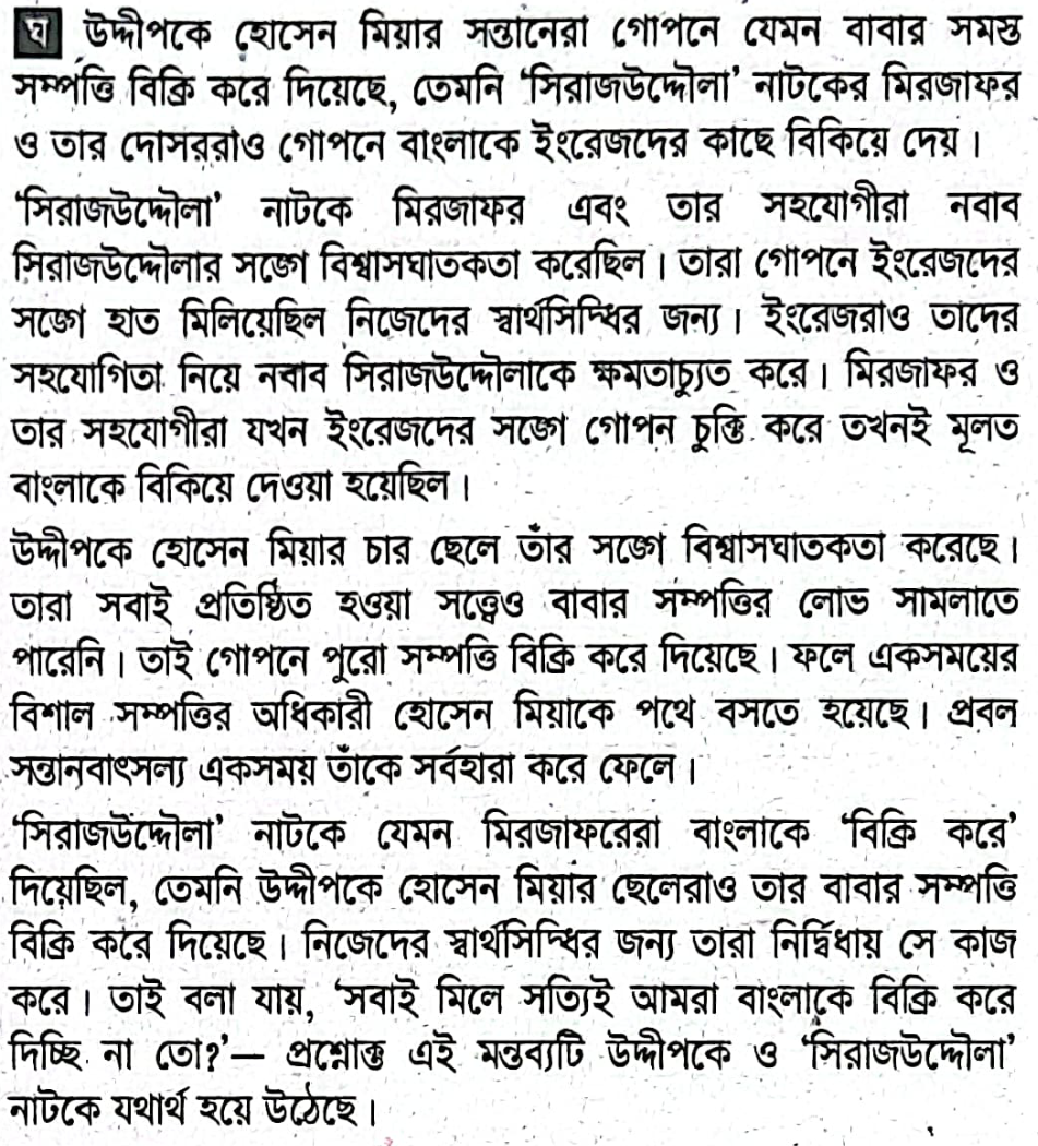 হোসেন মিয়া বিশাল সম্পত্তির অধিকারী। তার চার ছেলে সবাই প্রতিষ্ঠিত। কিন্তু প্রত্যেকেই নিজ নিজ স্বার্থের জন্য কৌশলী, মনোভাবের অধিকারী। হোসেন মিয়া সবকিছু বুঝতে পারলেও সন্তান হিসেবে তাদেরকে বারবার ক্ষমা করে দেন। তার এই অপরিসীম কোমল মনোভাবের কারণে একসময় ছেলেরা গোপনে পুরো সম্পত্তি অন্যের কাছে বিক্রি করে দেয় এবং শেষ পরিণতিতে হোসেন মিয়া রাস্তায় নেমে আসেন।`সবাই মিলে সত্যিই আমরা বাংলাকে বিক্রি করে দিচ্ছি না তো?` বক্তব্যটি উদ্দীপক ও `সিরাজউদ্দৌলা` নাটকের আলোকে ব্যাখ্যা করো।