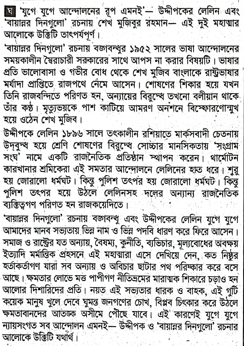 ১৮৯৬ সালে তিনি সেন্ট পিটার্সবার্গের মার্কসবাদী চরিত্রগুলোকে নিয়ে শ্রমিকশ্রেণির মুক্তির জন্য `সংগ্রাম সংঘ` নামে একটি রাজনৈতিক সংগঠনে ঐক্যবদ্ধ করেন। তার কাজকর্ম ক্রমশই বৃদ্ধি পায়। এই সময় থোর্নটোন কারখানায় শ্রমিকরা ধর্মঘট করে। তৎপর হয় জারের পুলিশ বাহিনী। লেলিনের সাথে সংগঠনের প্রায় সমস্ত নেতাকে গ্রেফতার করা হয়।`যুগে যুগে আন্দোলনের রূপ এমনই`- উদ্দীপক ও `বায়ান্নর দিনগুলো` রচনার আলোকে উক্তিটি বিশ্লেষণ করো।