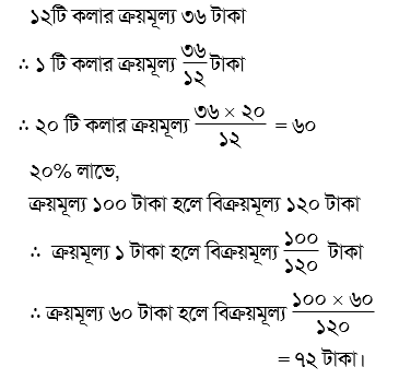 ৩৬ টাকা ডজন দরে কলা ক্রয় করে ২০% লাভে বিক্রয় করা হল। এক কুড়ি কলার বিক্রয়মূল্য কত হবে?