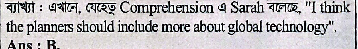 Conversational comprehension.Ron: Do you think the business conference went well?Sarah: Yes, but next year I think the planners should include more about global technology.Ron: I agree. We should know more about that.Question: What are does Sarah want to include in next year`s conference?……..