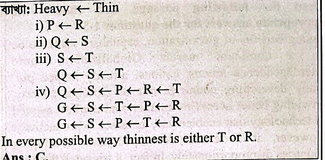R is thinner than P. Q is heavier than S. S is heavier than T. P is thinner than S. Who is the thinnest ?